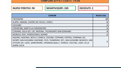 Sono 94 i casi positivi su oltre 1900 tamponi effettuati nelle ultime 24 ore in provincia di Frosinone. Il tasso