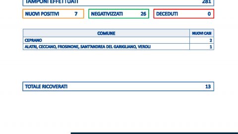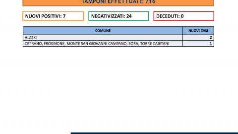 Sono sette i nuovi casi positivi al Covid in provincia di Frosinone su un totale di 716 tamponi processati. Zero