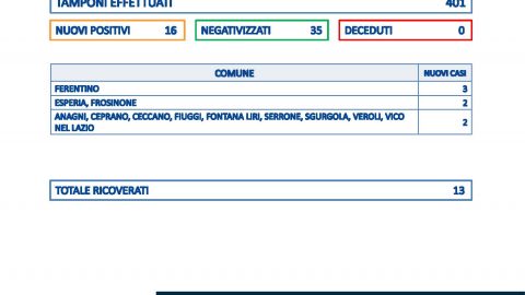 Sono 16 i nuovi casi emersi in Ciociaria nelle ultime 24 ore. I tamponi effettuati sono stati 401 ed il