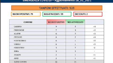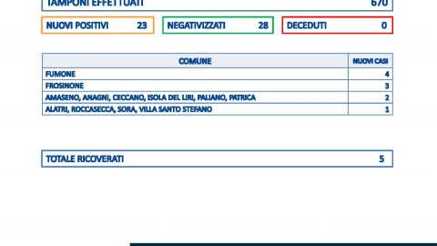 I nuovi casi positivi in provincia di Frosinone sono 23, su un totale di 670 tamponi effettuati. Il tasso di