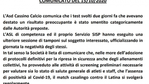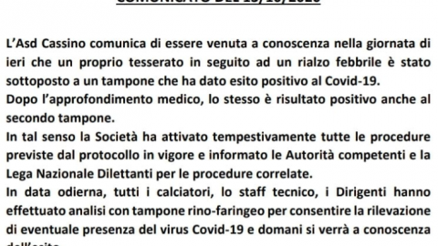 Un positivo al covid 19 tra i tesserati del Cassino calcio. A darne comunicazione è stata la stessa società che