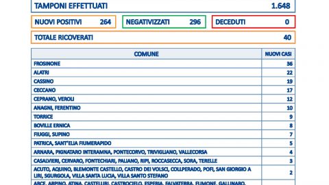 Zero decessi e 264 casi in provincia di Frosinone. Il tasso di positività è al 16% a fronte dei 1.648
