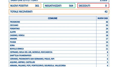 Sono 361 i casi in provincia di Frosinone su 2.026 tamponi, il tasso di positività è al 17,8%. 564 sono