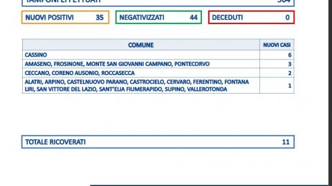Zero decessi tra la Ciociaria e il Pontino. Sono 35 i nuovi casi positivi in provincia di Frosinone emersi su
