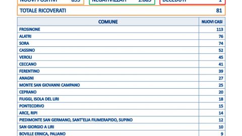 Zero decessi e 40 nuovi casi positivi emersi su 543 tamponi effettuali. questa la situazione in provincia di Frosinone dove