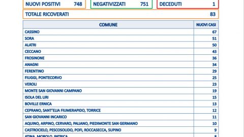 Continua la discesa di casi in provincia di Frosinone: sono 748 su 5532 tamponi processati, il rapporto è al 13,5%.
