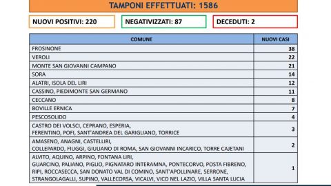 Resta stabile l’indice di positività in Provincia di Frosinone: su 1718 tamponi i contagiati sono 87. Il rapporto è al