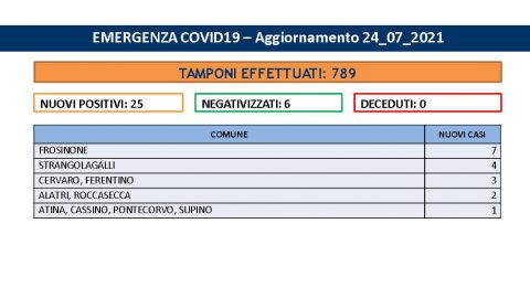Zero decessi in provincia di Frosinone dove su 789 tamponi effettuati sono emersi 25 nuovi casi di positivi. I negativizzati