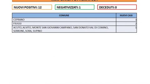 Ancora zero decessi in provincia di Frosinone. Sono 12 i nuovi casi positivi emersi su 521 tamponi effettuati. Di questi