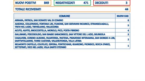 Covid – In provincia di Frosinone 849 casi e 3 decessi