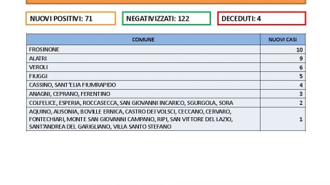 In provincia di Frosinone sono 71 i nuovi casi su 2.233 tamponi effettuati. Il tasso tra tamponi e nuovi positivi
