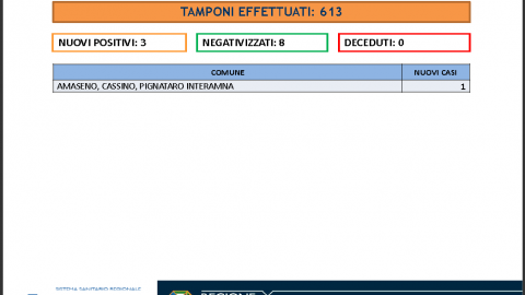 Nelle ultime 24h, sono stati effettuati 567 tamponi nel territorio della ASL di Frosinone. Sono stati registrati 3 nuovi casi