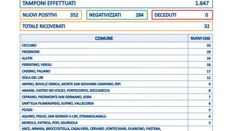 In provincia di Frosinone ci sono 352 nuovi casi emersi su 1.647 tamponi. Il tasso di positività al 21,3%. 284