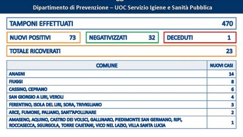 Come ogni lunedì basso il numero di casi Covid in Ciociaria. Per l’esattezza sono 73, emersi su 470 tamponi effettuati,