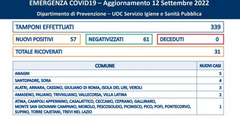 Nessuna vittima e 57 nuovi casi in provincia di Frosinone. Il tasso di positività sale al 16,9% a fronte dei