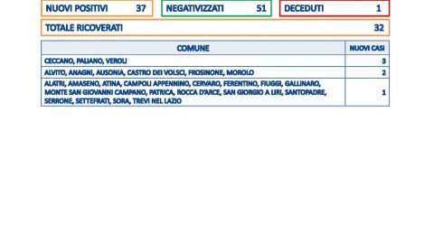 Sono 37 i nuovi positivi al Covid in provincia di Frosinone, dove si conta anche un decesso: si tratta di