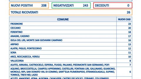 Nessuna vittima e 208 nuovi casi positivi in provincia di Frosinone. Il tasso di positività è al 15% a fronte