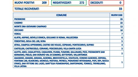 Covid – In Ciociaria 209 positivi e zero vittime