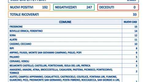 Nessun decesso in provincia di Frosinone dove i casi sono 192 emersi su 1.089 tamponi. Il tasso di positività è