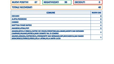Zero decessi in provincia di Frosinone dove si contano 67 casi positivi. Il tasso di positività è al 18,7%. 99