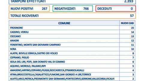 Zero decessi e 267 nuovi casi in provincia di Frosinone emersi su 2.393 tamponi processati. Il tasso di positività è