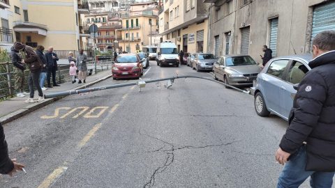 Paura nella zona alta di Frosinone per un palo dell’illuminazione pubblica precipitato a terra in via delle Fosse Ardeatine, poco
