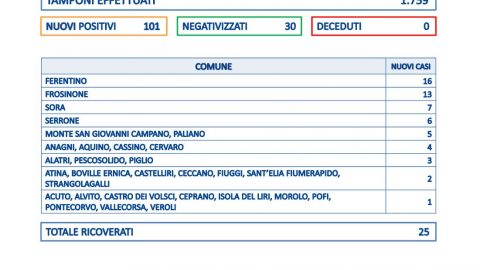 Sono 101 i nuovi casi in provincia di Frosinone emersi su 1.759 tamponi effettuati. Il tasso di positività si attesta