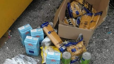 Confezioni di pasta, latte, biscotti e scatolame: ovvero un intero pacco alimentare della Caritas che è stato abbandonato a Piedimonte