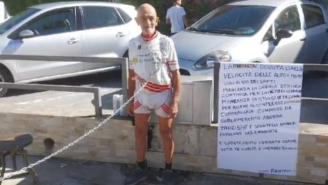 Singolare protesta questa mattina in via dei santi a sant’angelo in Theodice, frazione di Cassino. Il Signor Giovanni che vediamo