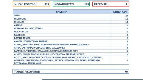 Covid – In provincia di Frosinone 227 nuovi casi e 2 decessi