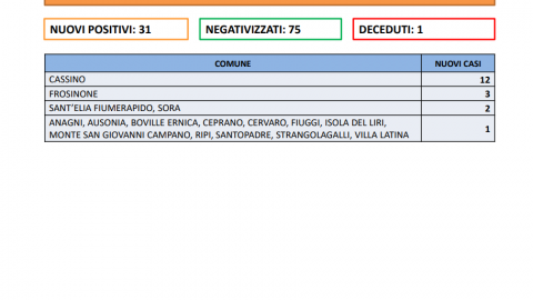 Covid – In provincia di Frosinone 31 nuovi casi e un decesso
