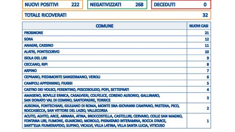 Zero decessi e 222 nuovi casi in provincia di Frosinone emersi su 1.087 tamponi. Il tasso di positività sale al