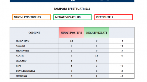Sono 83 i nuovi positivi al Covid 19 in Ciociaria: la Asl di Frosinone ha comunicato poco fa l’aggiornamento. I