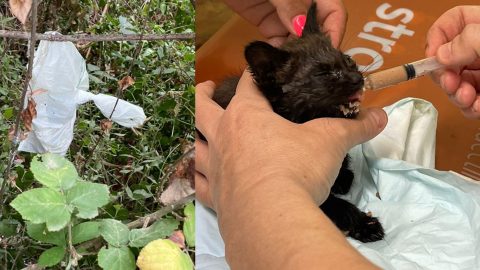 Un gattino chiuso in un sacchetto di plastica appeso al ramo di un cespuglio. E’ quello che hanno trovato i