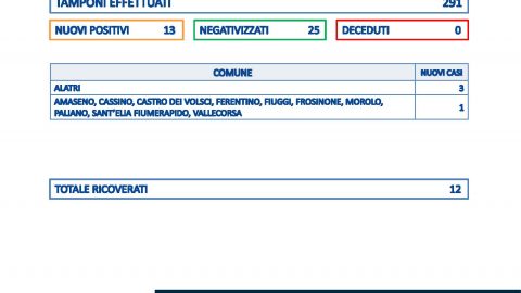 Come ogni lunedì sono molti meno i tamponi processati dalla Asl di Frosinone e di riflesso pochi nuovi casi. I