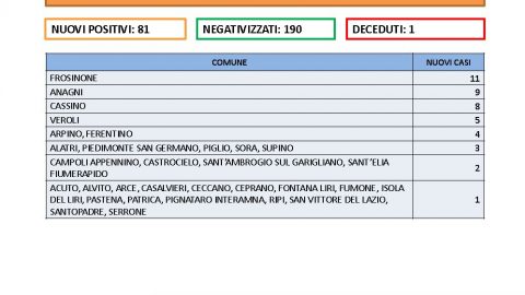 In provincia di Frosinone su 1.456 tamponi effettuati sono stati registrati 81 nuovi positivi al coronavirus. Il rapporto è al