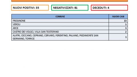 Come ogni lunedì è in netto calo il numero delle positività registrate in provincia di Frosinone: 35 nuovi casi su