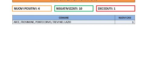 Ancora zero decessi in provincia di Frosinone dove su 580 tamponi effettuati sono emersi 5 nuovi casi. Nei comuni di Atina,