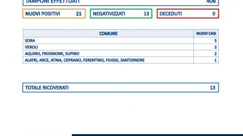 Zero decessi e ricoverati in calo: in provincia di Frosinone sono 21 i nuovi casi positivi emersi su 406 tamponi