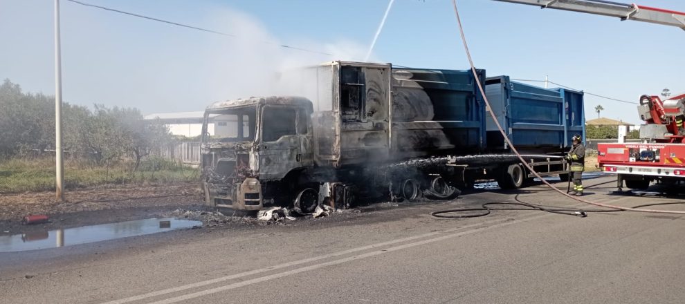 Un camion in fiamme lungo la via Pontina all’altezza del km 94 Pontina.