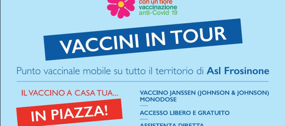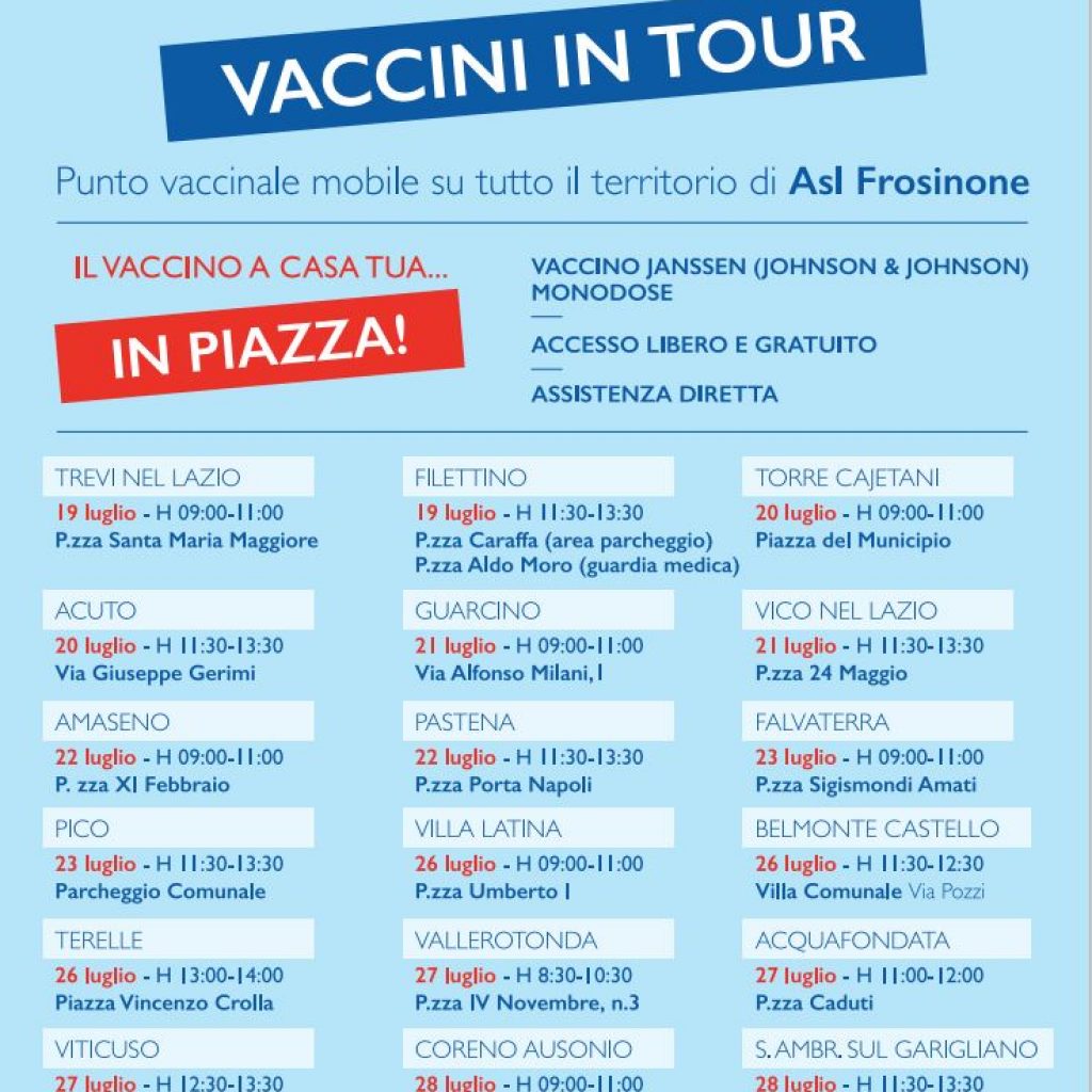 Programma in corso di aggiornamento: – Asl Frosinone: 19 luglio, Trevi nel Lazio e Filettino – 20 luglio, Torre Cajetani e Acuto – 21 luglio Guarcino e Vico nel Lazio – 22 luglio, Amaseno e Pastena – 23 luglio Falvaterra e Pico – 26 luglio, Villa Latina, Terelle e Belmonte Castello – 27 luglio, Vallerotonda, Acquafondata e Viticuso – 28 luglio, Coreno Ausonio e S. Ambrogio Garigliano – 29 luglio Colle San Magno
