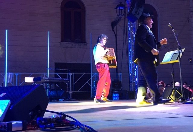 Una piazza Santa Salome stracolma di pubblico che, in modo attivo con balli, canti e battiti di mano continui, hanno accompagnato festosamente l’esibizione dei due prestigiosi artisti e di una incantevole Orchestra Popolare Italiana, un mix di organetti, flauti, percussioni, violino, basso e chitarra, con coreografie e balli di giovanissimi ballerini che per vivacità e colori, hanno contaminato per oltre due ore tutti gli spettatori.