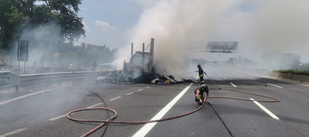 Camion in fiamme in A1, A 700 mt dall’ uscita autostradale di Cassino al Km668,700 in direzione sud nel territorio di villa santa Lucia. A bruciare l’intero carico di vestiti.