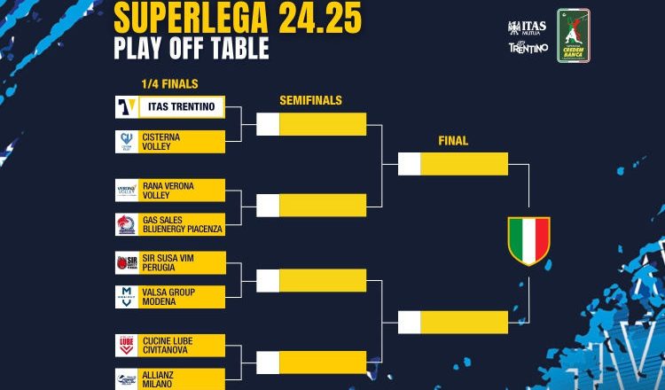 Con lo svolgimento dell’ultimo turno di regular season, ufficiale e definitivo il tabellone dei quarti di finale dei Play Off Scudetto 2025 di Superlega. Gli accoppiamenti sono: Trentino-Cisterna, Verona-Piacenza, Perugia-Modena, Civitanova-Milano.